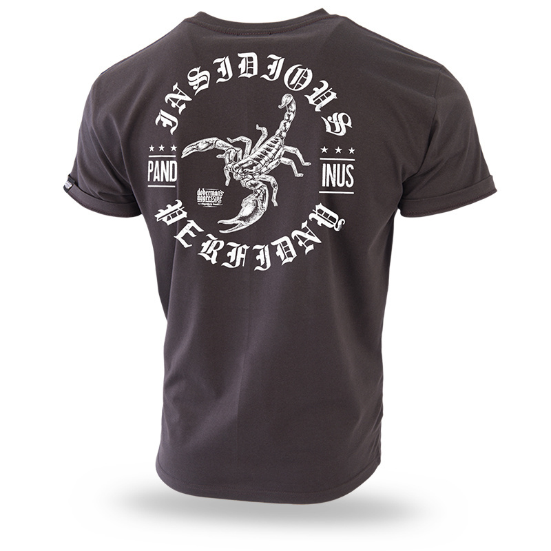A small label with the brand logo is sewn on the left sleeve. The new INSIDIOUS model with a characteristic graphic on the back, depicting a scorpion with the addition of Gothic inscriptions. On the front, a smaller graphic referring to the back of the shirt.