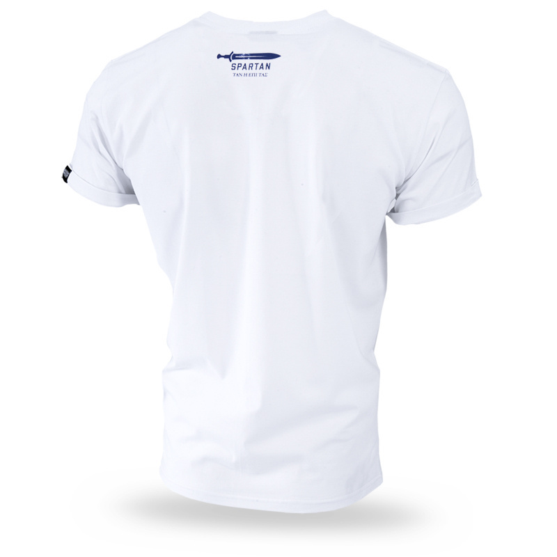 Men's T-shirt in a standard cut. Made of high quality cotton. A small label with the brand logo is sewn on the left sleeve. On the front there is a graphic of a Spartan helmet and sword with a large inscription SPARTAN FOR THE GLORY. On the back there is a small graphic referring to the front of the T-shirt.