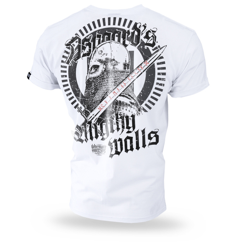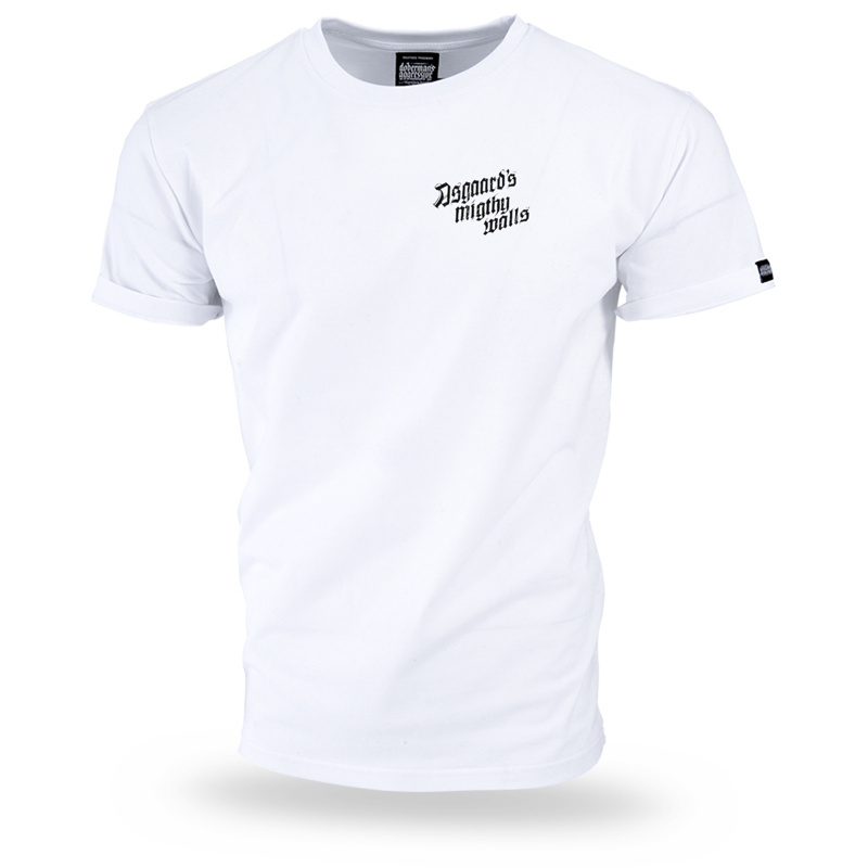 Men's T-shirt in a standard cut. Made of high quality cotton. A small label with the brand logo is sewn on the left sleeve. On the back there is a graphic of a Viking holding a sword decorated with Nordic elements. On the front on the left chest there is the inscription Asgaard's mighty walls.