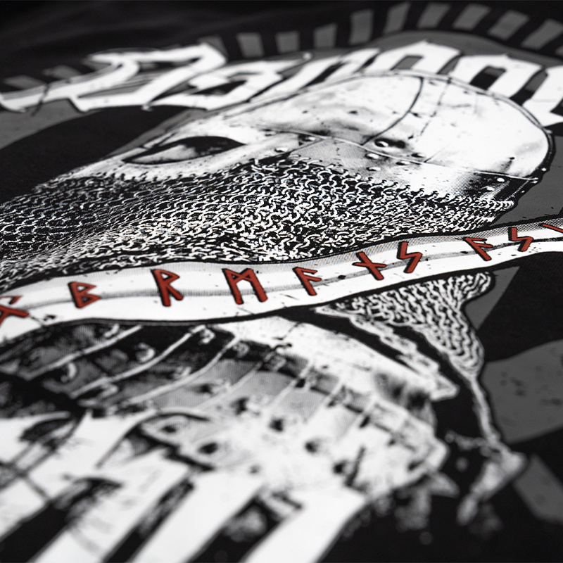 Men's T-shirt in a standard cut. Made of high quality cotton. A small label with the brand logo is sewn on the left sleeve. On the back there is a graphic of a Viking holding a sword decorated with Nordic elements. On the front on the left chest there is the inscription Asgaard's mighty walls.