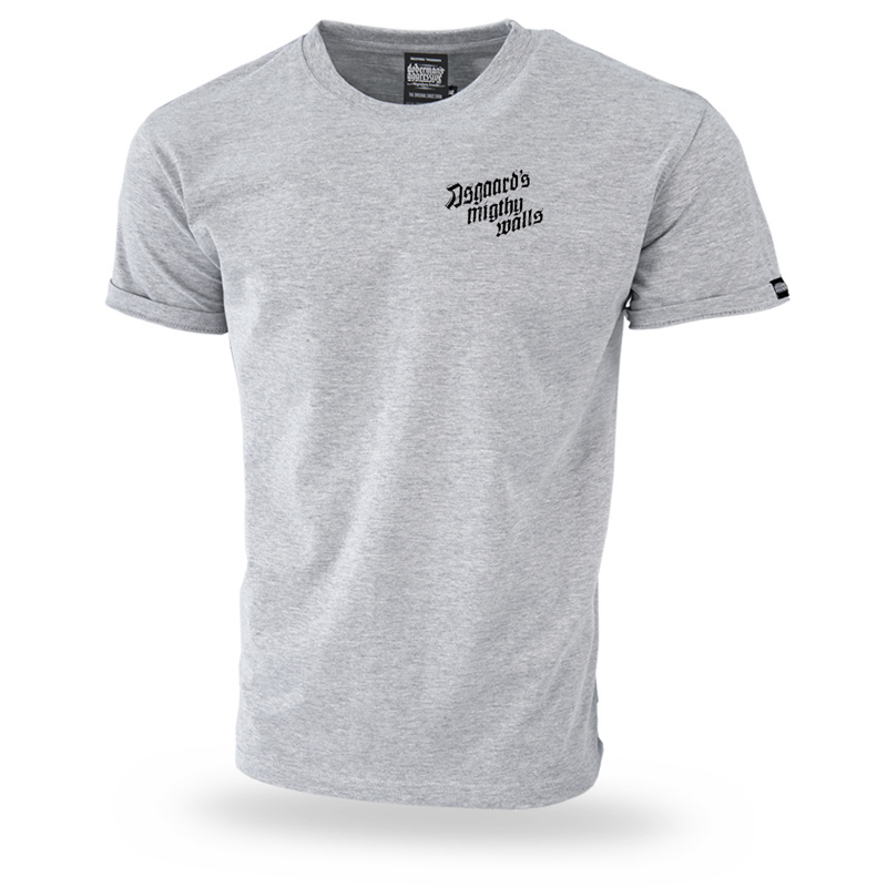 Men's T-shirt in a standard cut. Made of high quality cotton. A small label with the brand logo is sewn on the left sleeve. On the back there is a graphic of a Viking holding a sword decorated with Nordic elements. On the front on the left chest there is the inscription Asgaard's mighty walls.