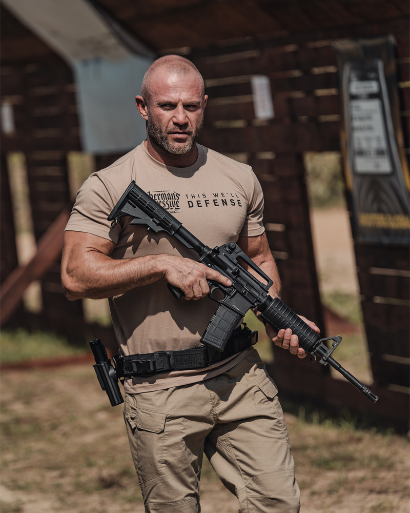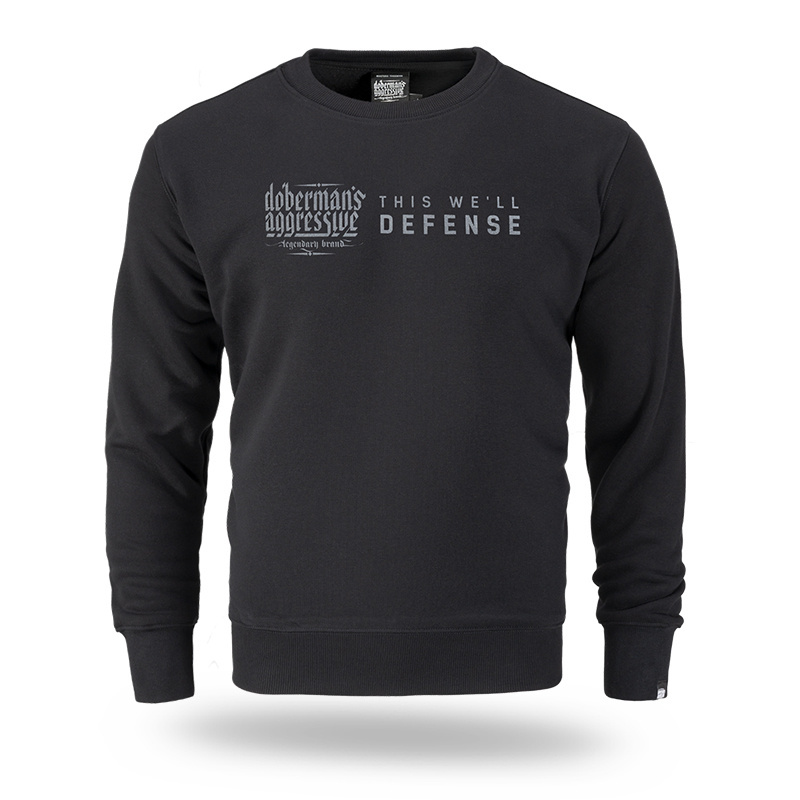 Classic sweatshirt made of high quality cotton. A small label with the brand logo is sewn on the left sleeve. The bottom of the sweatshirt and sleeves are finished with a wide elastic band. The brand logo is located on the front of the sweatshirt on the chest, and next to the logo is the inscription THIS WE'LL DEFENSE.