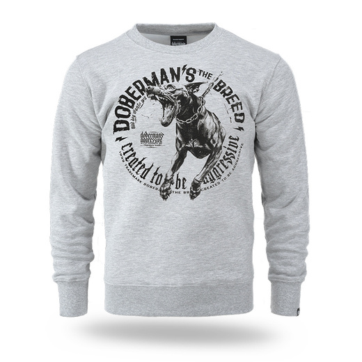 A comfortable model made of high-quality materials that provide comfort when worn. On the front, a large graphic of an aggressive Doberman, surrounded by dynamic inscriptions: DOBERMAN'S THE BREED and CREATED TO BE AGGRESSIVE. Elastic cuffs on the sleeves and at the bottom ensure a good fit to the figure.