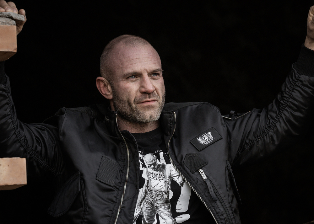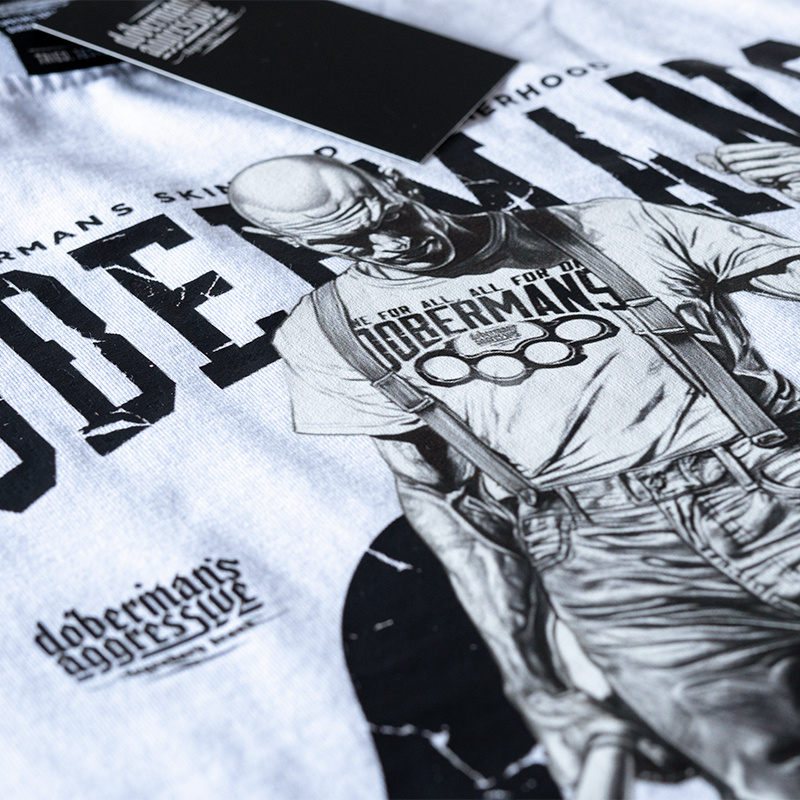 T-shirt made of high quality cotton, providing comfort and durability. On the front there is a large, detailed print of the Skinheads character with a baseball bat in his hand. In the background there is a large logo and the inscription "DOBERMANS A WAY OF LIFE", giving the whole a raw, street character. A model dedicated to people who value bold patterns and style inspired by street subcultures.