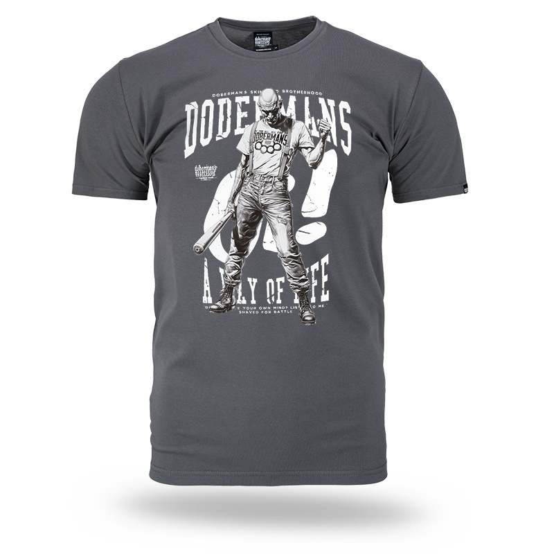 T-shirt made of high quality cotton, providing comfort and durability. On the front there is a large, detailed print of the Skinheads character with a baseball bat in his hand. In the background there is a large logo and the inscription "DOBERMANS A WAY OF LIFE", giving the whole a raw, street character. A model dedicated to people who value bold patterns and style inspired by street subcultures.