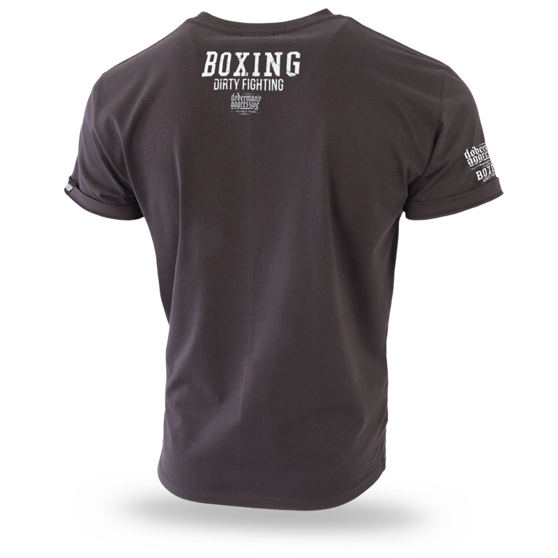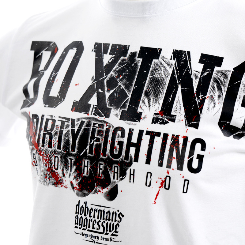 Men's T-shirt with a classic cut and short sleeves. Made of the highest quality cotton. On the right sleeve there is a print with the brand logo and the inscription BOXING DIRTY FIGHTING. Left sleeve with a small Doberman's Aggressive label sewn on. On the front there is the inscription BOXING DIRTY FIGHTING and the brand logo against the background of clenched boxing fists. The back is plain, on the neck there is a miniature graphic from the front of the T-shirt.