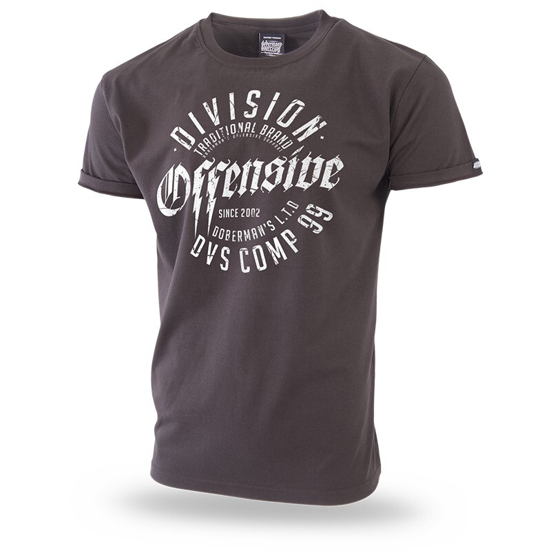 Men's T-shirt with print on the chest. Graphic in the form of a circle composed of inscriptions. In the middle Offensive made in a gothic font. Around the slogan Division, DVC COMP 99. Graphic in one color. On the back a smaller print with two lightning bolts. Clothing made of high quality cotton weighing 200g. T-shirt with short sleeves in a classic cut. At the neck finished with a narrow welt that improves comfort of use.