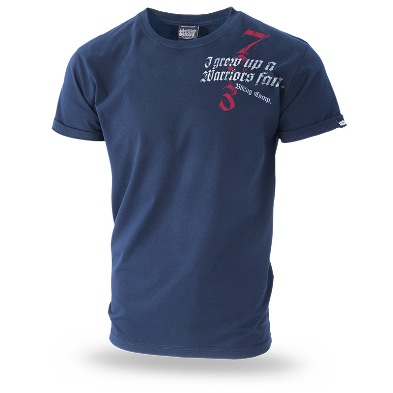 High-quality T-shirt with a two-colour print inspired by Scandinavian culture. The back of the T-shirt is decorated with a graphic covering almost the entire surface of the product, depicting a Viking helmet and tops. Above is a large Bloodaxe inscription, below is the slogan "I grew Up A Warriors Fan", repeated on the front in a smaller scale. The date 793 and the note Viking Comp have been added. A Gothic font and a cracked print effect have been used. The T-shirt is made of 100% cotton, in a standard men's cut, finished with a rib at the neck and an inner pleat. A black label with the company logo on the sleeve.