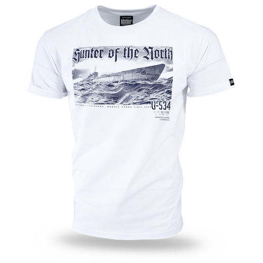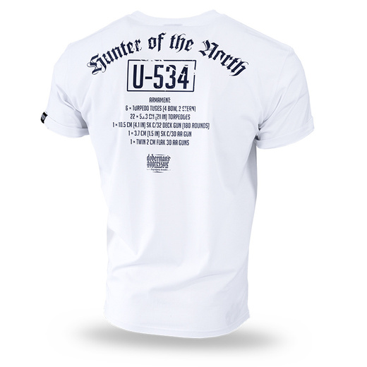 T-shirt made of high quality cotton, ensuring comfort and durability. Gothic inscription Hunter Of The North added. On the back the same slogan in the form of an arc, below the designation of the ship model with a detailed armament. Different types of fonts and a cracked print effect were used. T-shirt in a standard men's cut, finished with a practical cuff at the neck. On the sleeve a small black label signed with the Doberman's Aggressive brand logo. Model made of 100% cotton weighing 200g. Historical collection.
