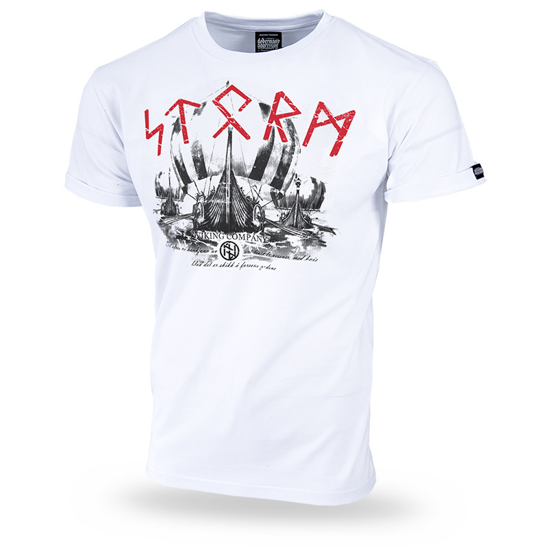On the side of the shirt there is a red insert with the brand's logo. Nordic-style print. A pattern with three drakkars at sea, the inscription Nordic Company and a large print Storm. On the neck there is a small embroidered shield with runic signs. Single-colour embroidery, made on the shirt material.