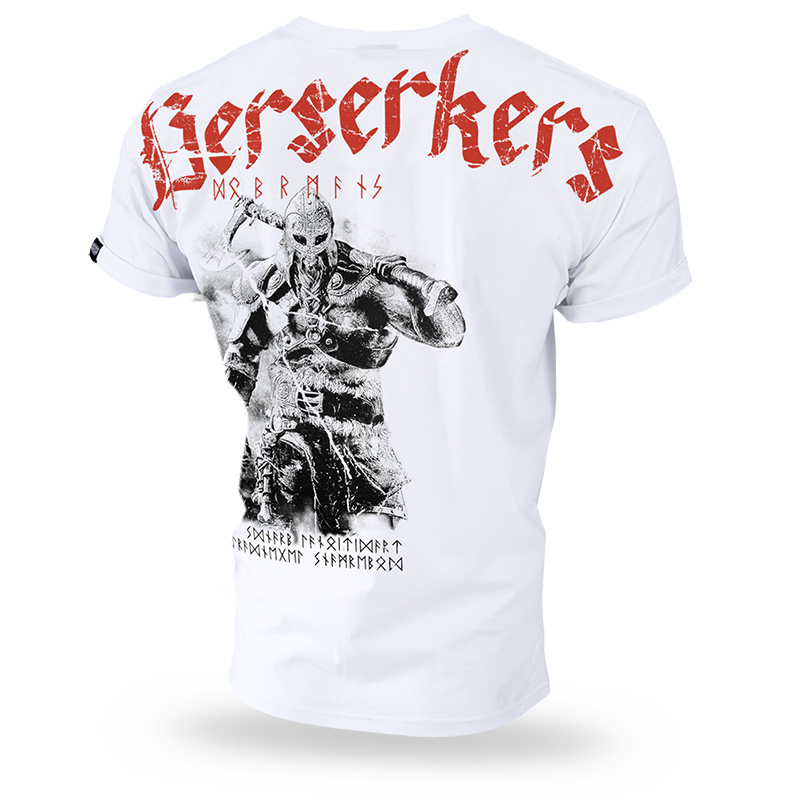 Men's short-sleeved T-shirt made of high-quality cotton. Standard cut of the T-shirt, the material composition is 100% cotton with a weight of 200 g. On the left chest, just by the sleeve, red runic symbols are printed. On the back of the T-shirt, a large print with a figure, the inscription Berserkers passing through the seams of the sleeves and runic words. Print on almost the entire surface of the T-shirt.