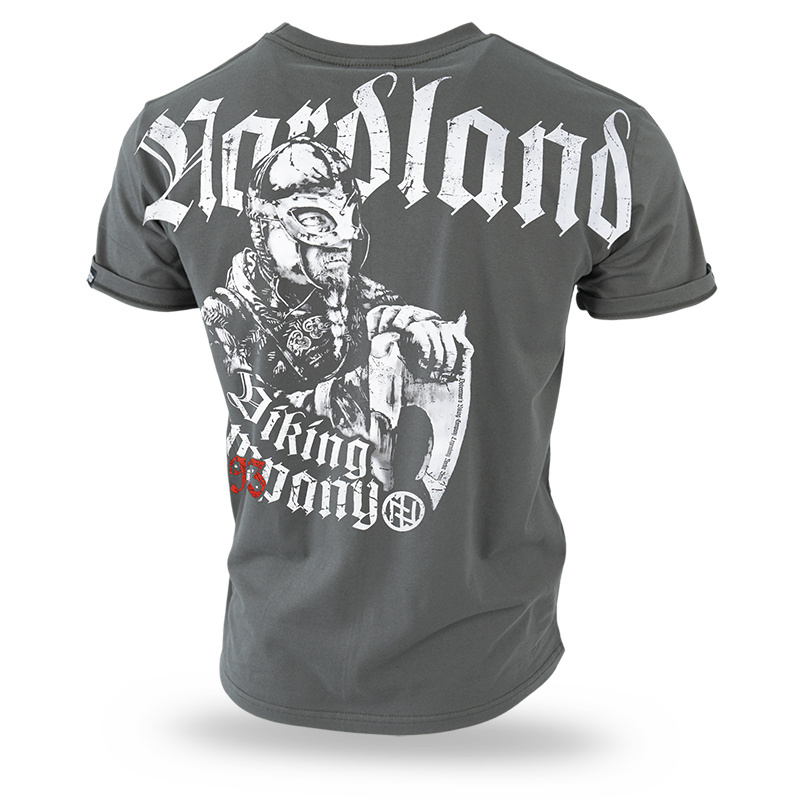 T-shirt with Scandinavian-style graphics. On the back, a large print depicting a Viking warrior with an axe. Below, the inscription Viking Company in the form of an arc, a small shield with runic signs and the date 793. On the shoulder blades, a large Nordland slogan, passing through both seams of the sleeves and repeated on the front of the shirt in the form of a small, vertical print placed along the left seam. Men's short-sleeved T-shirt, made of 100% high-quality cotton.