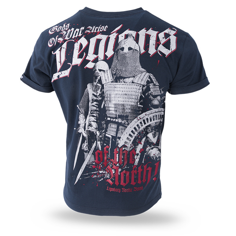 Classic men's T-shirt in a simple design. Made of high-quality 200g cotton. Finished with a narrow pleat under the neck. Small label with the company logo on the left sleeve. On the front, at the left edge of the shirt, a print with a large Legion inscription. The back is almost entirely printed. In the center of the graphic are two warriors in full armor. Above the slogan Legions on the North. Two-color pattern.