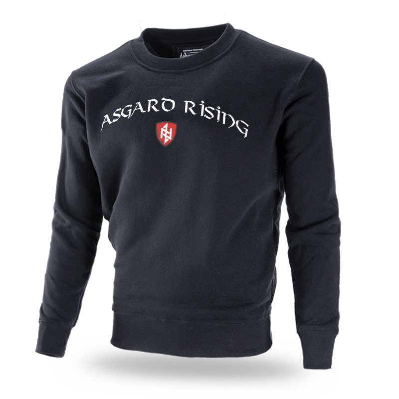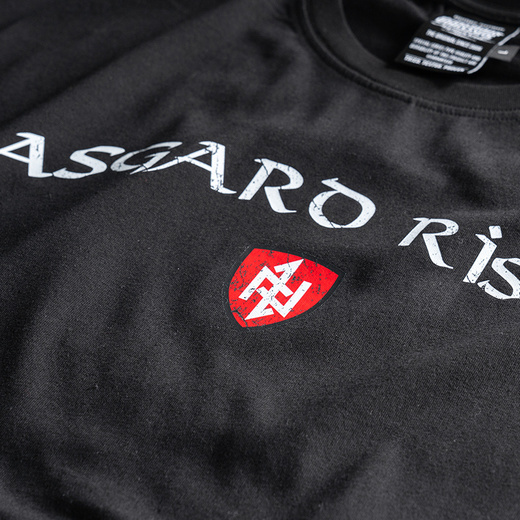 Made of high quality 320g cotton. A small label with the brand logo is sewn on the left sleeve. The bottom of the sweatshirt and sleeves are finished with a wide elastic band. On the front of the shirt there is the inscription Asgard Rising with an additional Nordic symbol in the shape of a shield.