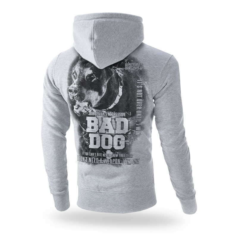 On the left sleeve there is a small label with the brand logo. The hood is decorated with a thick string and fittings with the brand logo. The Bad Dog model shows a furious Doberman, below it there is a large inscription "Bad Dog". On the front of the sweatshirt there is the inscription "Bad Dog" and the brand logo.