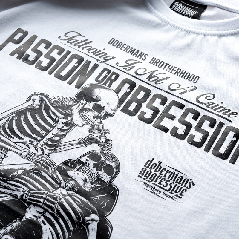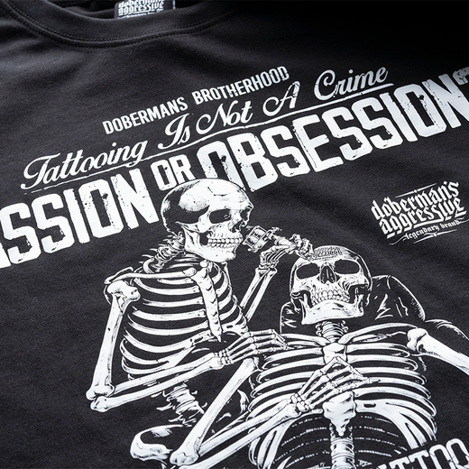 Made of high quality 320g cotton. A small label with the brand logo is sewn on the left sleeve. The bottom of the sweatshirt and sleeves are finished with a wide cuff. This model is aimed at tattoo enthusiasts. The main motif is a graphic of two skeletons getting a tattoo, and the inscription Passion Or Obsession?
