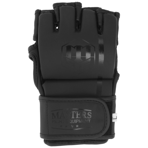 The GFT-MATT MMA gloves are made of synthetic leather with a matte black finish. The palm is open, with an exposed thumb for gripping. They fasten with a long, wide Velcro strap for wrist support.