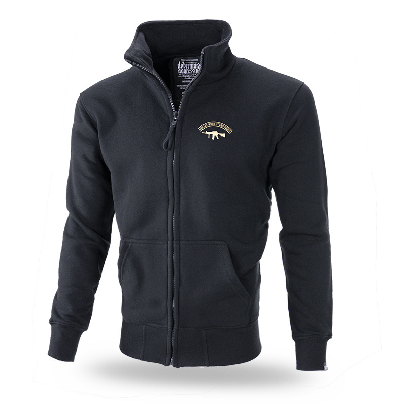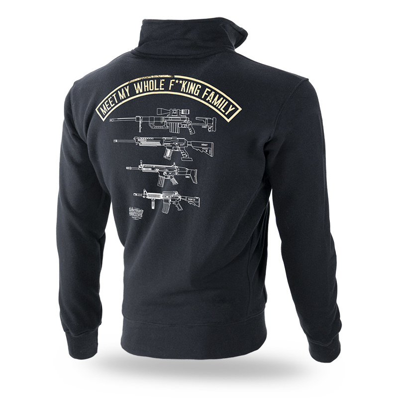 Made of high-quality cotton, it ensures comfortable wear. The bottom and sleeves are finished with strong ribbed cuffs. The Fuck Family model features a print of rifles representing a family, complemented by the words "Meet My Whole F**king Family" and a small Doberman's brand logo.