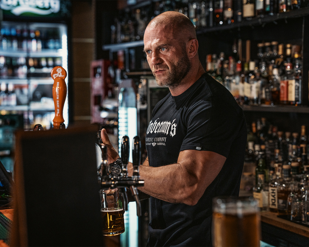 Made of 200g cotton, the garment features a small label with the Doberman's Aggressive logo on the left sleeve. A large "Dobermans" lettering in Gothic script appears on the front of the shirt. The design is complemented by additional text below and Nordic symbols.
