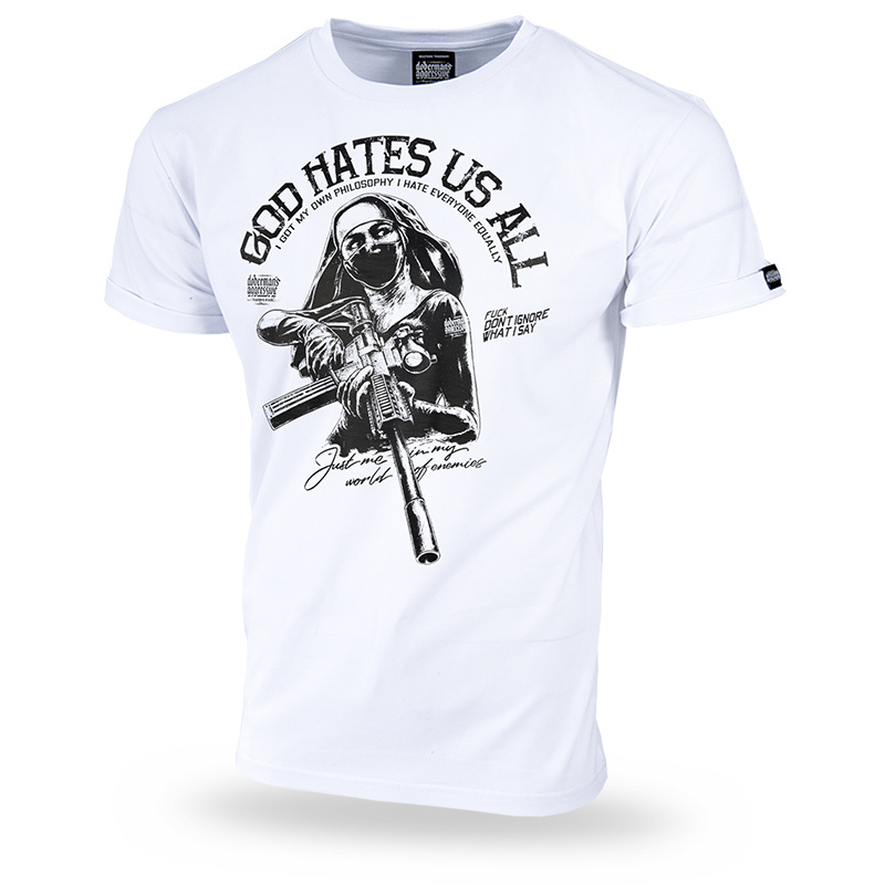 A simple, standard-fit T-shirt made of high-quality 200g cotton. It features a narrow ribbed neckline. A small label with the Dobermans Aggressive logo is located on the left sleeve. The Nun model, created for a select few, features a large print of a nun with a gun, the words GOD HATES US ALL, and the Dobermans Aggressive brand logo.