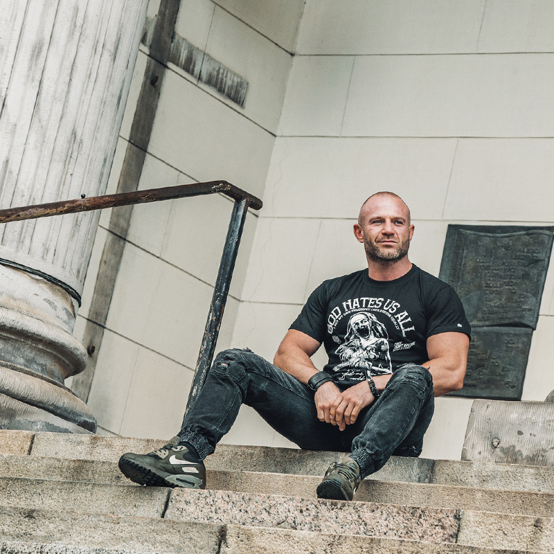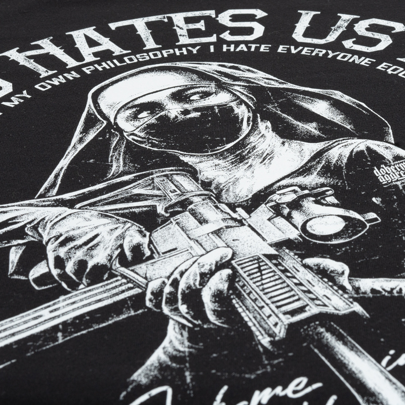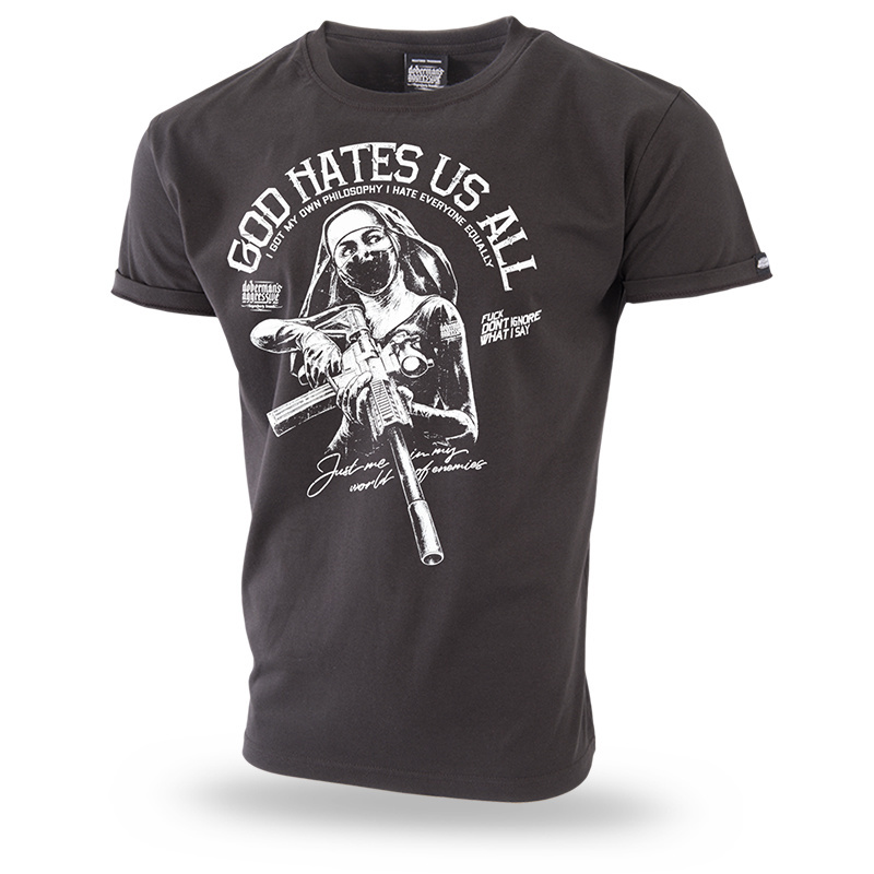 A simple, standard-fit T-shirt made of high-quality 200g cotton. It features a narrow ribbed neckline. A small label with the Dobermans Aggressive logo is located on the left sleeve. The Nun model, created for a select few, features a large print of a nun with a gun, the words GOD HATES US ALL, and the Dobermans Aggressive brand logo.