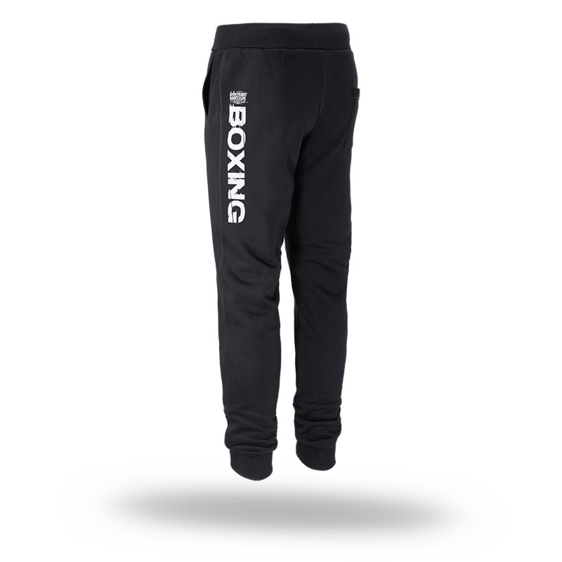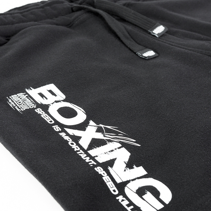 The waistband features an elastic drawstring and drawstrings. A single-color print with the word BOXING and the brand logo is located on the front of the right leg, below the pocket. The back of the left leg also features the word Boxing with the brand logo.