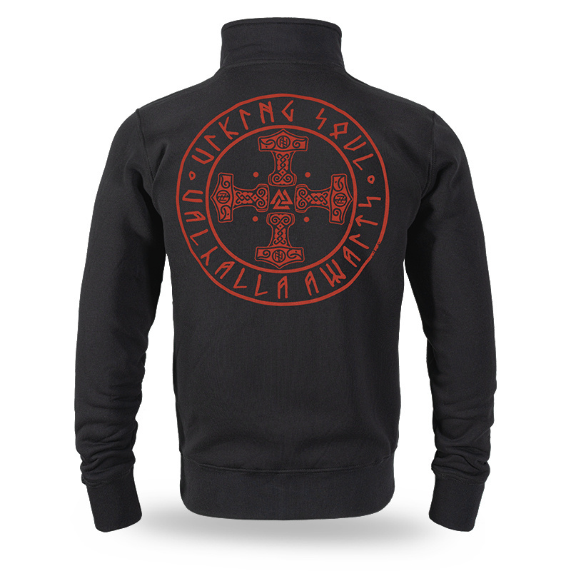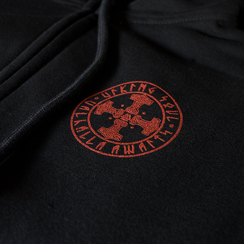 Made of high-quality cotton, it ensures comfortable wear. This model features a print on the back featuring a Nordic cross motif adorned with runic inscriptions and Viking symbols. The inscriptions read: VIKING SOUL – VALHALLA AWAITS. A smaller print, referencing the main motif, is located on the front chest.