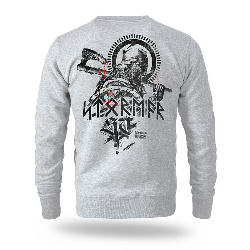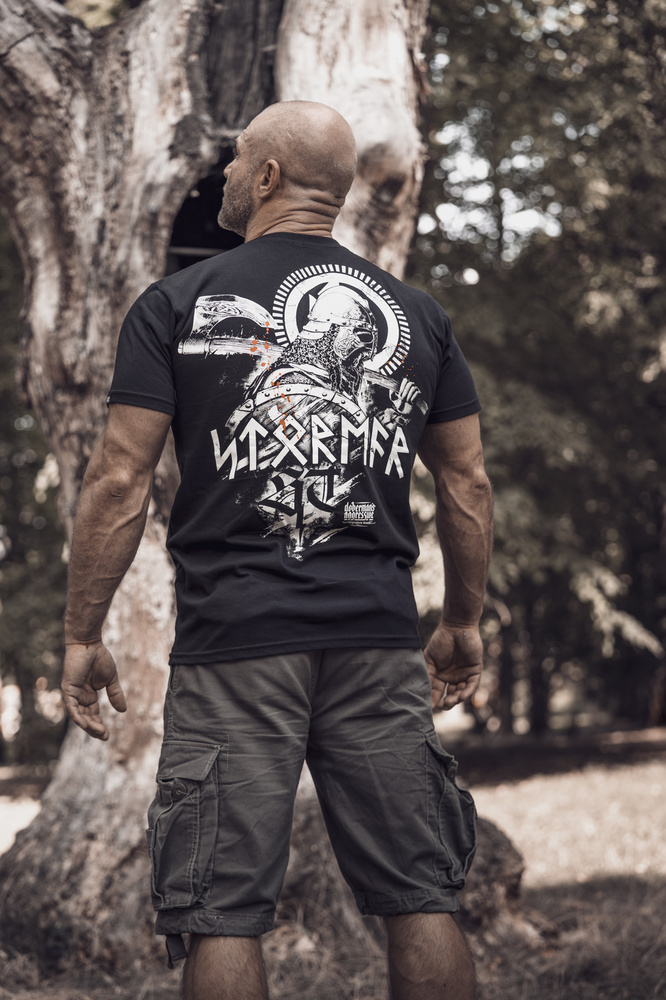 The model features a striking print on the back depicting a helmeted Norse warrior holding a shield and axe. The design is complemented by a large "STORMER" lettering, stylized as a runic alphabet, which also appears on the front chest.