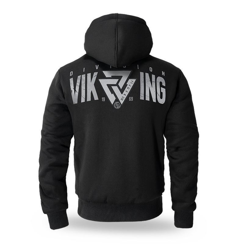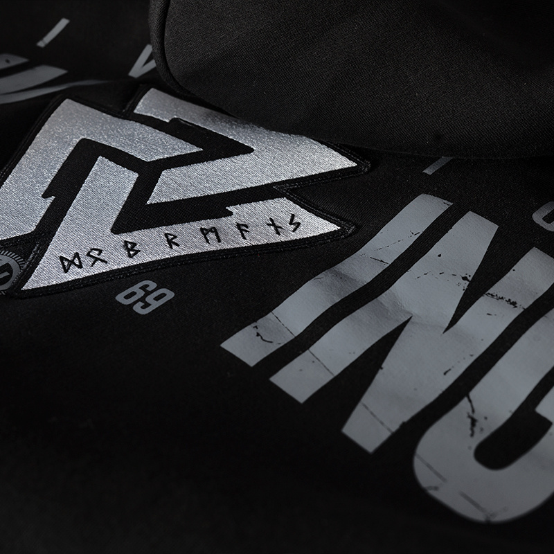 Made of high-quality cotton, with ribbed cuffs and two front pockets. The hood is adorned with a wide drawstring and brand logo hardware. This sweatshirt is from the Valknut series, inspired by Nordic symbolism. The back of the sweatshirt is decorated with a combination of an embroidered Valknut symbol and a Viking Division print. A miniature Nordic symbol is embroidered on the left chest.