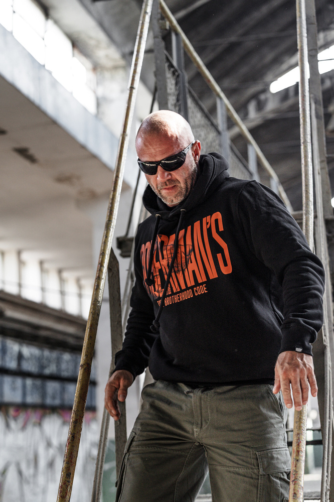 Featuring a Doberman pinscher graphic and the slogan "THE BROTHERHOOD CODE" on the front, this sweatshirt is made of high-quality cotton and finished with ribbed cuffs and hem.