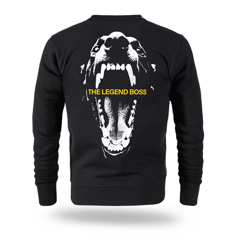 A small "THE LEGEND BOSS" inscription is emblazoned across the chest, while the back features a large graphic of a dog's open mouth and the inscription "THE LEGEND BOSS" in a contrasting color. Made of high-quality cotton, the shirt ensures comfortable wear.