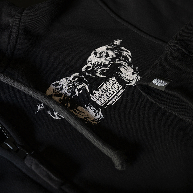 Made of high-quality cotton, it ensures comfort and durability of the print. This model features a bold print on the back, depicting two angry Dobermans and the slogan "Dobermans off mad as hell." A smaller print with the same graphic motif is featured on the front.