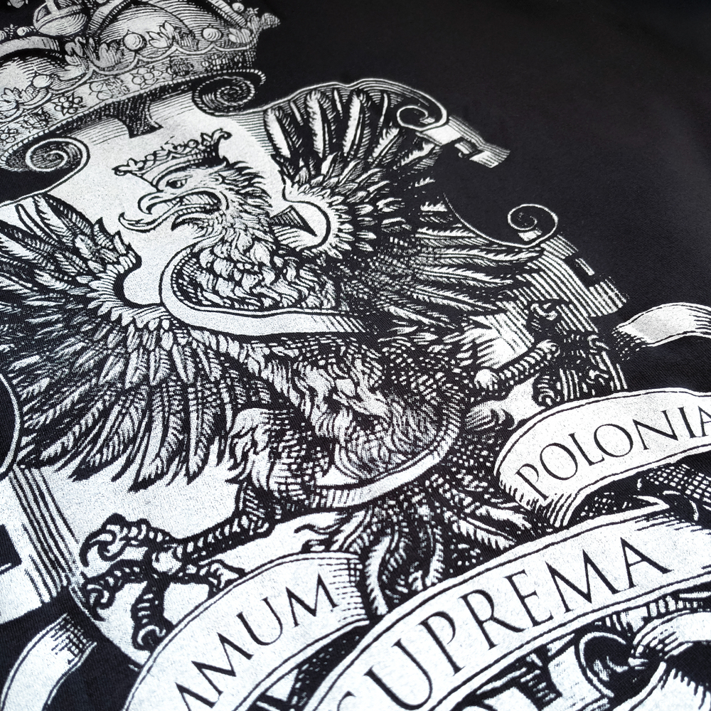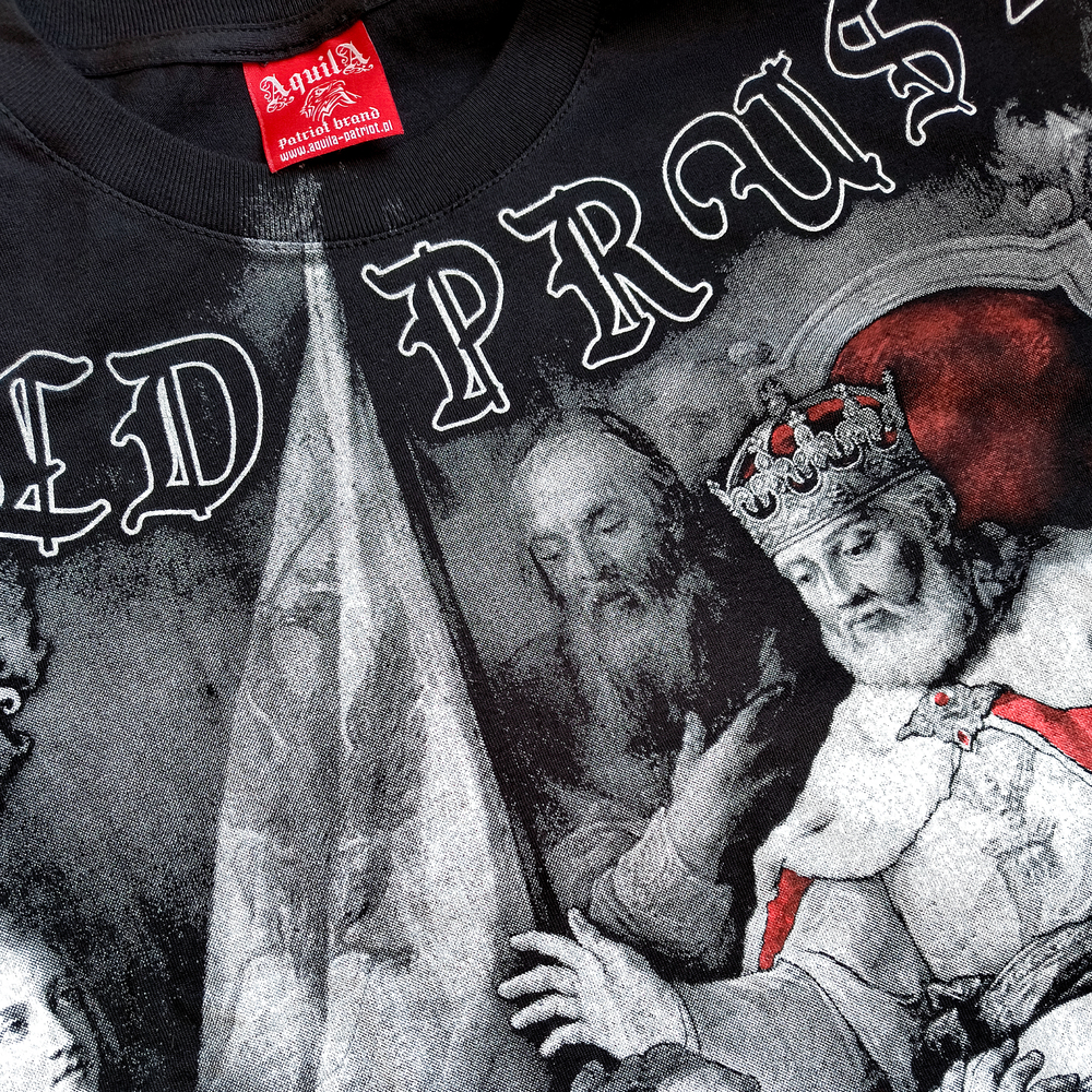A unique patriotic T-shirt with a motif referencing the Prussian Homage. Made of high-quality black cotton by a Polish clothing manufacturer, the T-shirt's design and production were meticulously crafted with meticulous attention to detail. The print on the T-shirt was created using sublimation. It is highly durable and will not fade with use. The product should be washed at a temperature not exceeding 40 degrees Celsius (104 degrees Fahrenheit), which will significantly extend the print's durability.