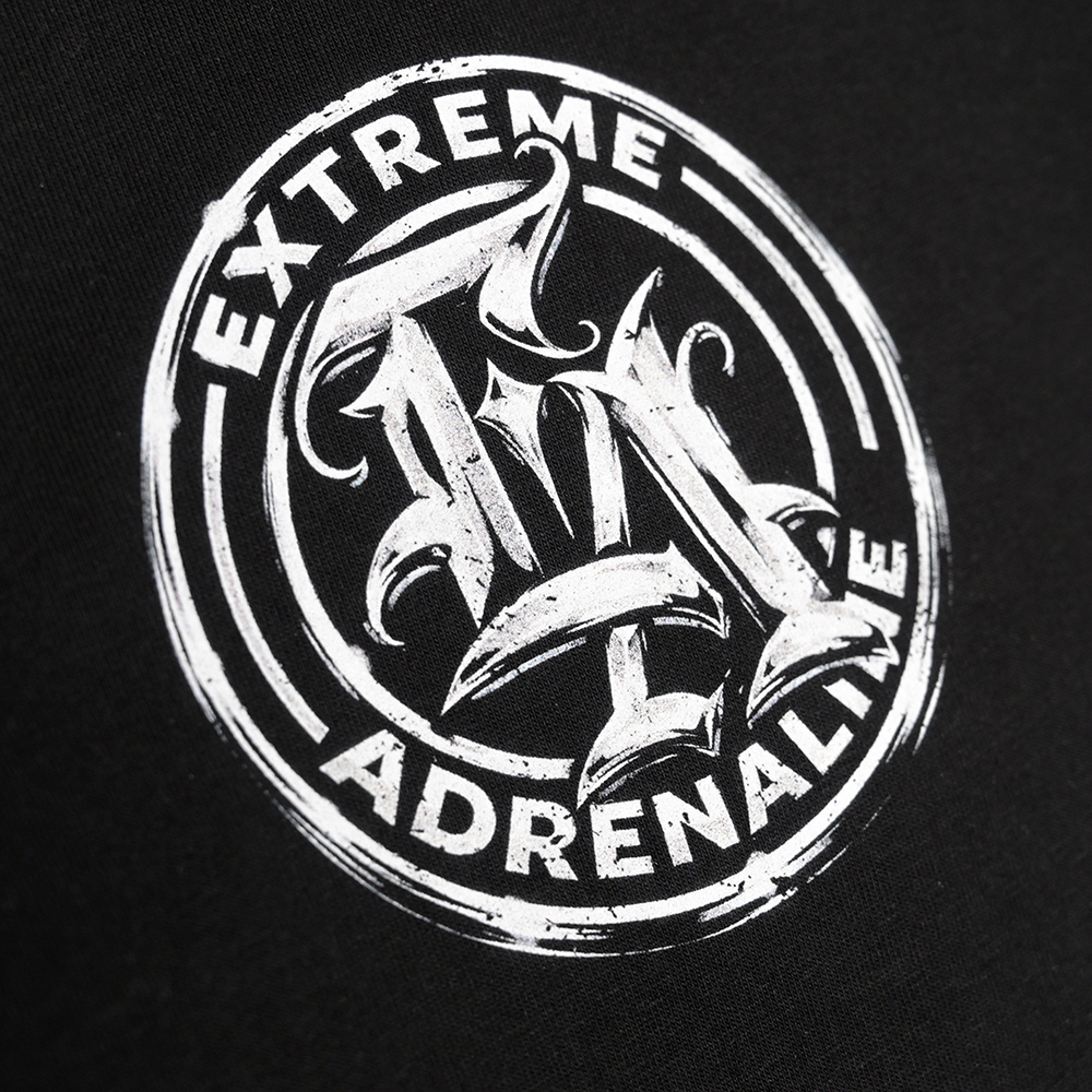 This black men's hoodie from Extreme Adrenaline is a visually striking piece, combining a dark aesthetic with modern streetwear style. The front features the manufacturer's minimalist, white logo in the form of a circular emblem with the decorative letters EA.