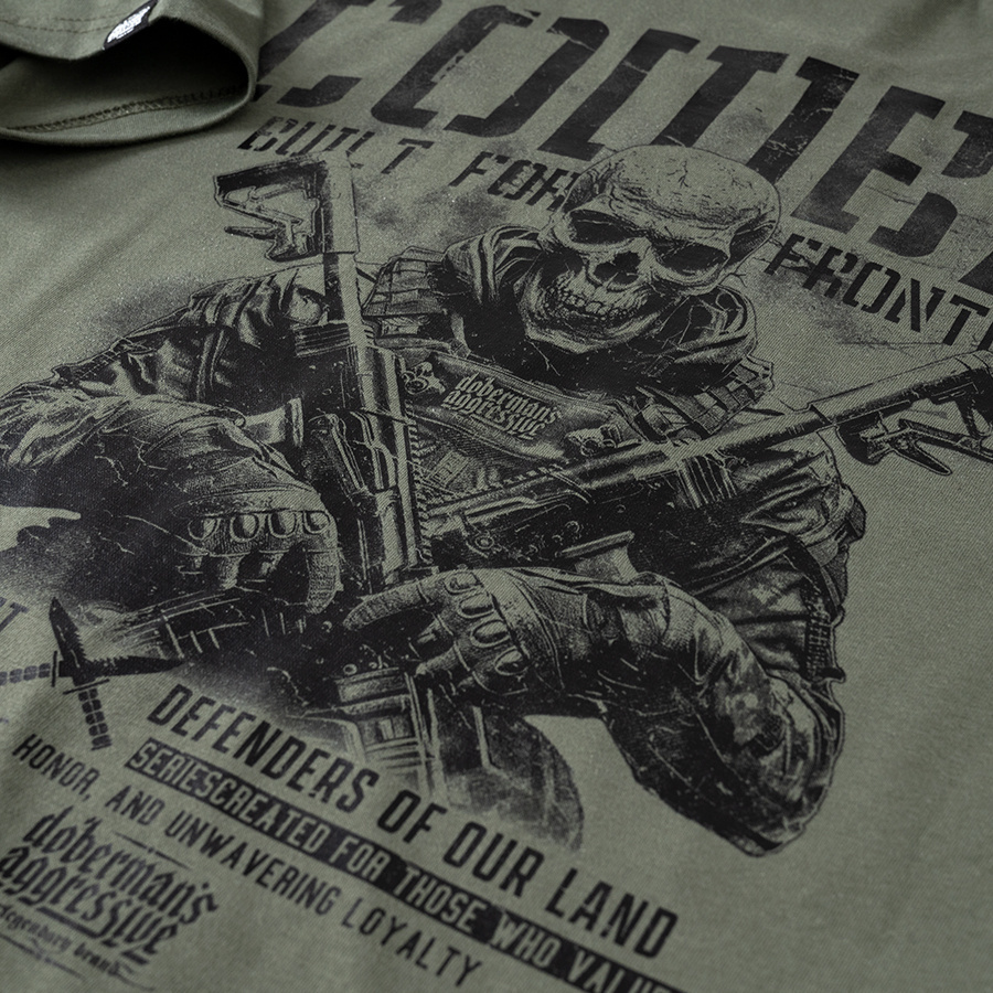 A large, bold print with a tactical motif and the slogan "Combat – Built for the Frontline" on the back lends a decisive, combat-inspired feel. A smaller emblem on the chest, consistent with the main graphic, adorns the front. Elastic cuffs at the neckline, cuffs, and hem ensure a perfect fit and complete freedom of movement in any situation.