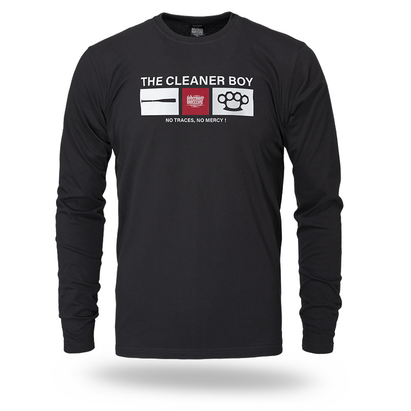 The men's CLEANER BOY Longsleeve from Dobermans Aggressive is a streetwear option, crafted from high-quality cotton. The front features a bold "THE CLEANER BOY" print, complemented by graphics of a baton, the red brand logo, and brass knuckles. The design is finished with the eloquent slogan "NO TRACES, NO MERCY!" The regular fit T-shirt features a ribbed crew neckline for comfort and durability during everyday wear.
