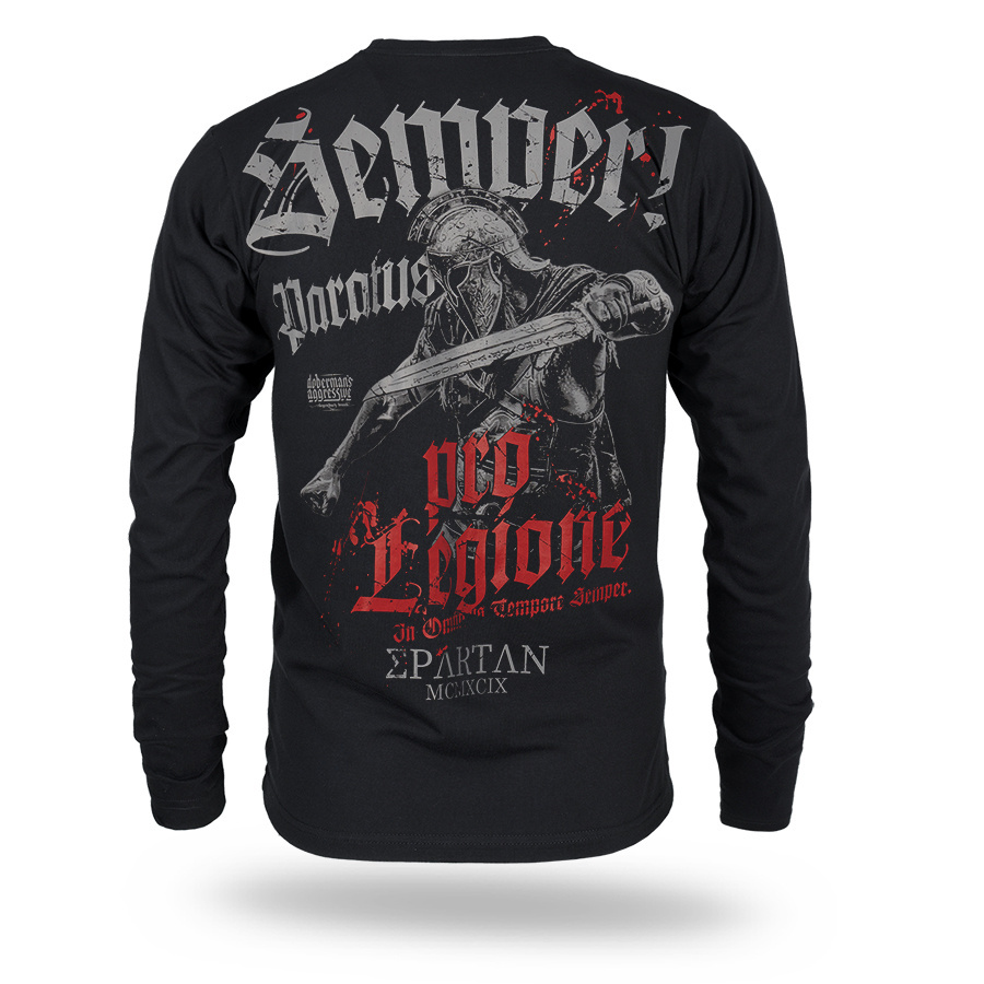 The SEMPER PARATUS men's long sleeve shirt from Dobermans Aggressive is a striking design that embodies the spirit of preparedness and military strength characteristic of Doberman's Aggressive. It features a classic, comfortable cut with long sleeves and a crew neckline, ensuring complete freedom of movement and comfort during everyday wear. The design's key element is the large, dynamic print on the back. It depicts an armed warrior in a helmet and sword, surrounded by the Gothic slogan "Semper Paratus" (always ready) and the contrasting red inscription "Pro Legione." At the bottom of the design is the inscription "Spartan MCXCIX." A small, cohesive emblem placed at chest height completes the front of the shirt, giving the entire piece a balanced, technical look.