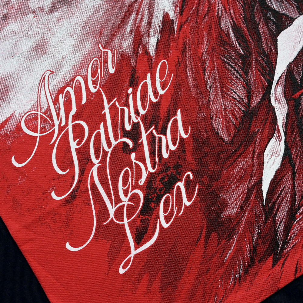 This red men's patriotic T-shirt is a design rich in symbolism, combining national motifs with historical symbols of struggle and faith. The front of the T-shirt is dominated by a dynamic, black-and-white graphic depicting the head of the White Eagle , captured in expressive movement against a backdrop of outstretched wings. On the left side is the silhouette of Giewont with its distinctive cross , while the bottom of the design is adorned with the Latin motto "Amor Patriae Nostra Lex" (Love of the Fatherland is our law). The front is complemented by an arched, white "POLSKA" inscription at the top.