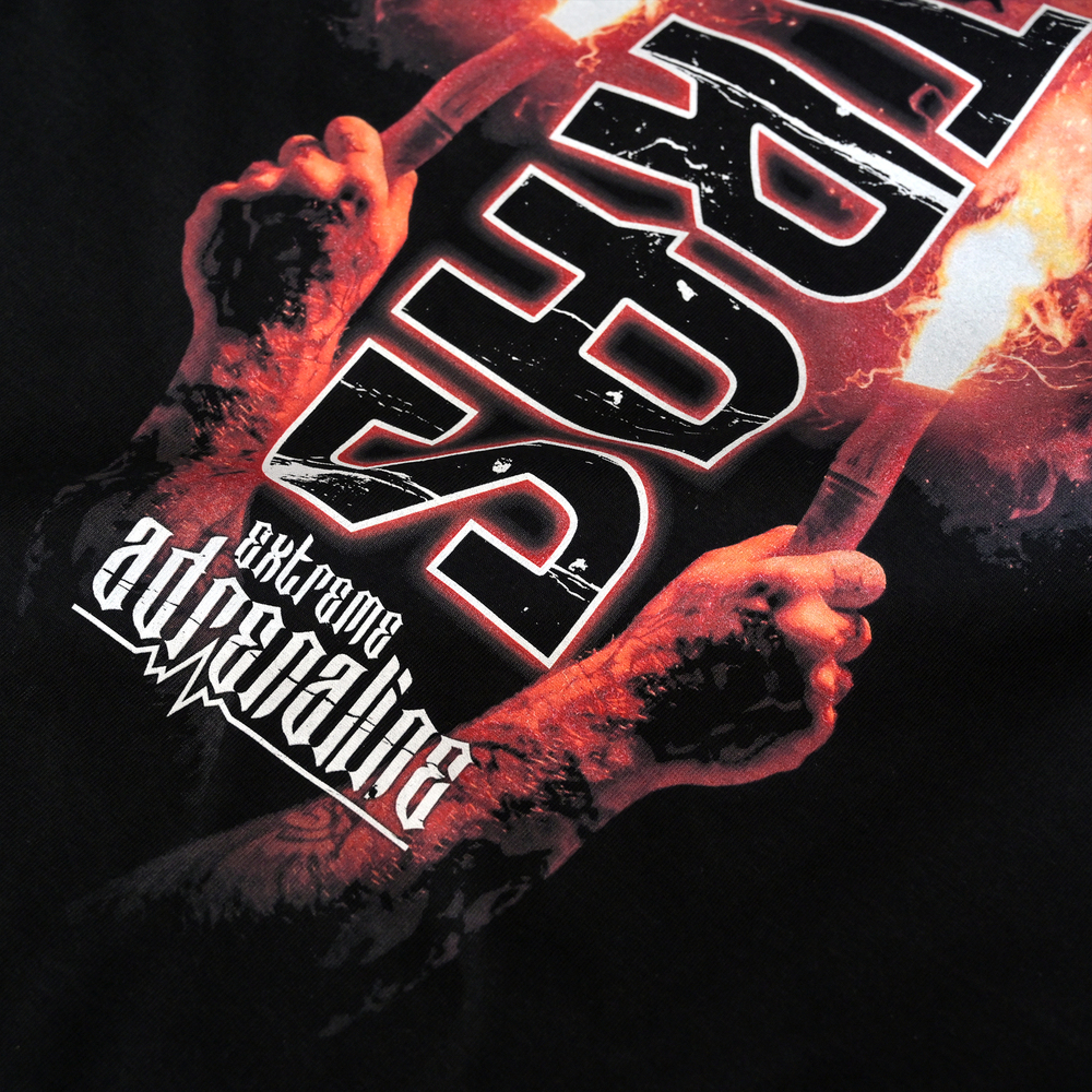 The true manifestation of fanaticism, however, is the back of the sweatshirt, where a large, vertical "ULTRAS" lettering is placed, surrounded by the glow of two raised flares, creating a powerful, symmetrical composition that illuminates the entire back of the garment. Beneath the graphic is the logo of the Extreme Adrenaline brand, a brand that has been providing unique designs for stadium subcultures for years.