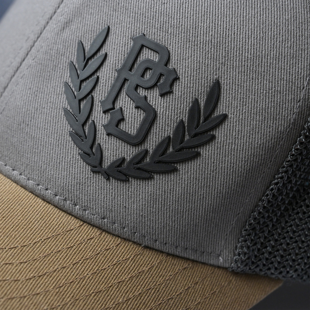This trucker cap is the perfect blend of classic style with modern color accents that set it apart from standard headwear. Its design features a three-color scheme , combining a subdued gray front with a brown, slightly curved visor and dark mesh at the back. The cap's focal point is a unique 3D rubber print depicting the PS logo within a laurel wreath. This innovative technique makes the logo convex , tactile, and extremely durable, lending the cap an exclusive and modern touch. The breathable polyester mesh ensures excellent air circulation, making it an indispensable choice for hot days and outdoor activities.