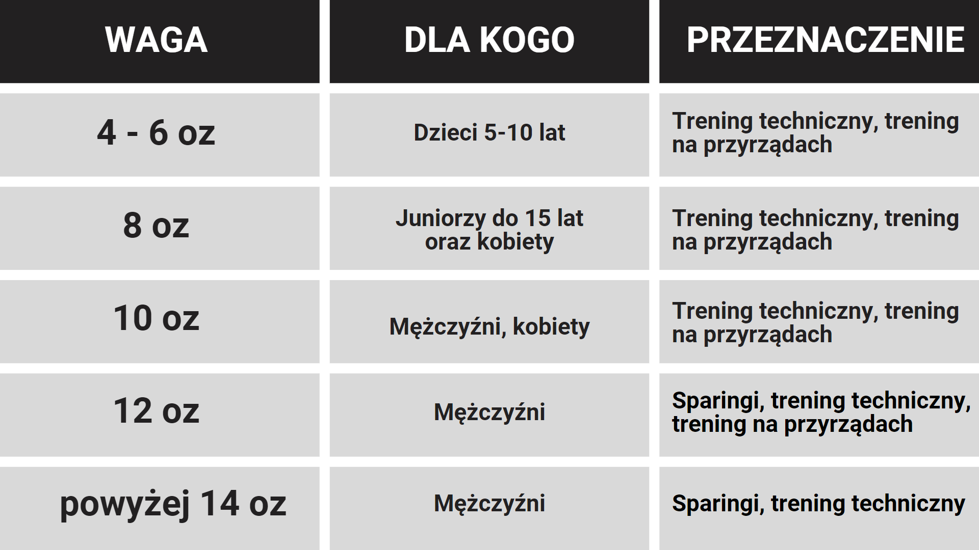 Ok, mamy już przeznaczenie oraz rozmiar i wagę, więc zostawiamy tu jeszcze tabelkę z podsumowaniem. Możesz w niej odczytać nasze sugestie doboru rękawic do danych treningów. Nie jest to oczywiście żadna prawda objawiona, jedynie nasza propozycja, którą możesz się na początek zasugerować. Decyzja i tak będzie zależeć od Twojego komfortu. Co więcej może się ona zmienić wraz z nabywaniem przez Ciebie doświadczenia.