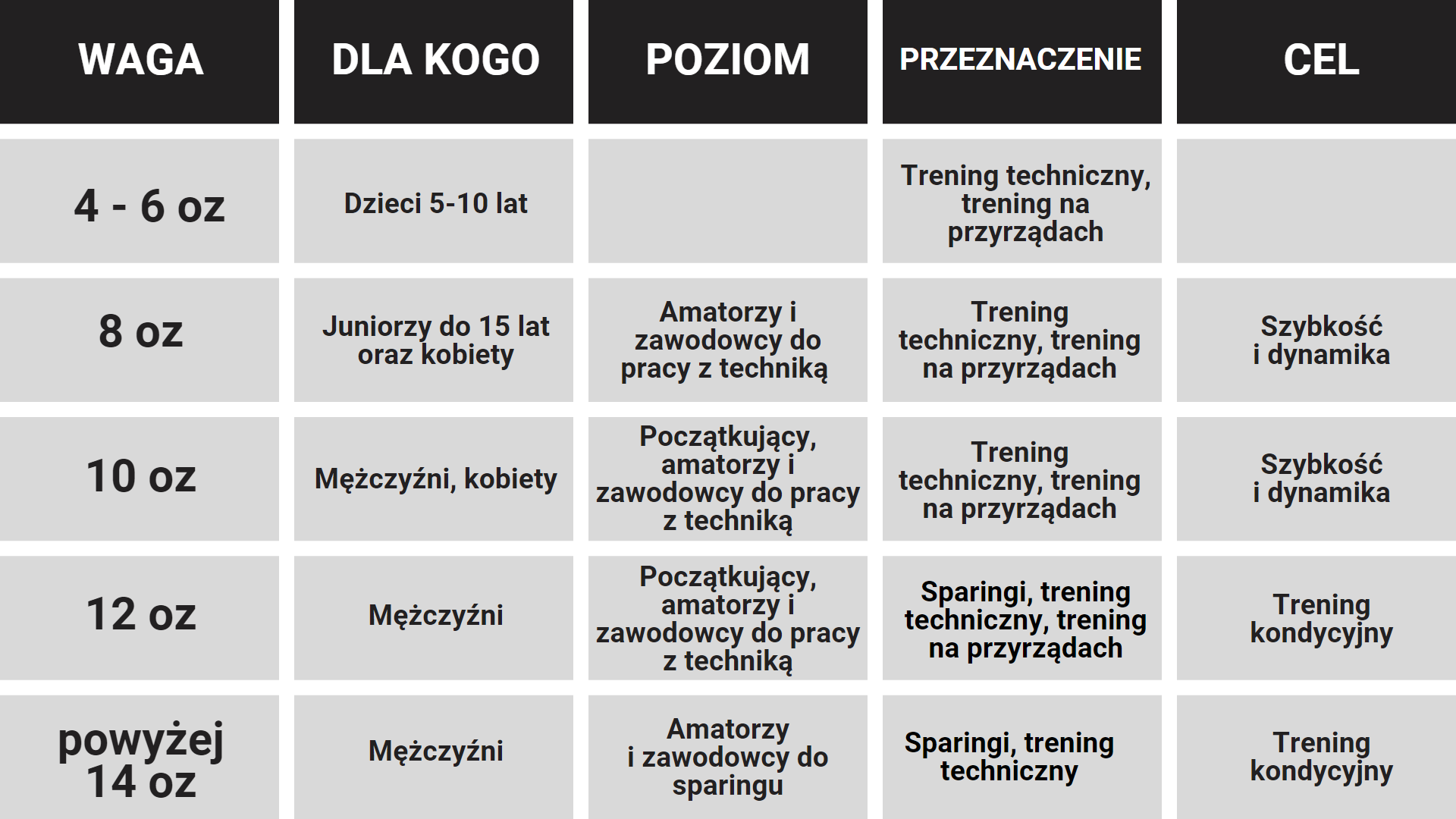 Tak jak obiecaliśmy, oto tabela, która podsumowuje powyższe informacje odnośnie kryteriów doboru wagi rękawic bokserskich.